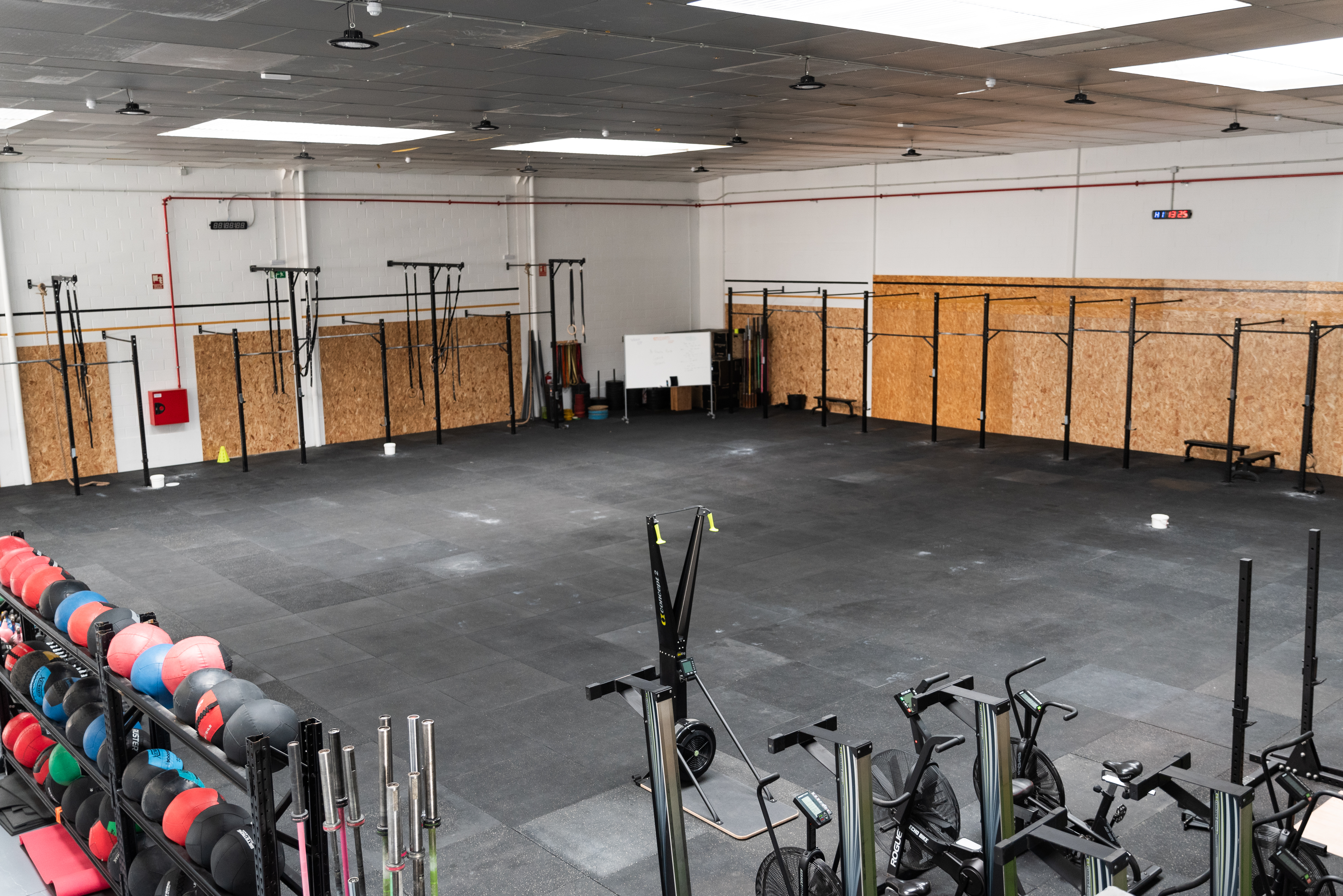 Dos racks, que aprovechan dos paredes completas de la nave, nos aportan 11 estaciones con amplio espacio entre ellas. Las clases de Open Box cuentan con su propia zona diferenciada, que incluye dos estaciones móviles y tres estaciones de halterofilia con suelo de madera. A su lado, bicicletas, remos y SkyErg pueden usarse en el sitio o distribuirse en la zona de entrenamiento según necesidad. Al fondo, dos trineos tienen su espacio de césped dedicado.
